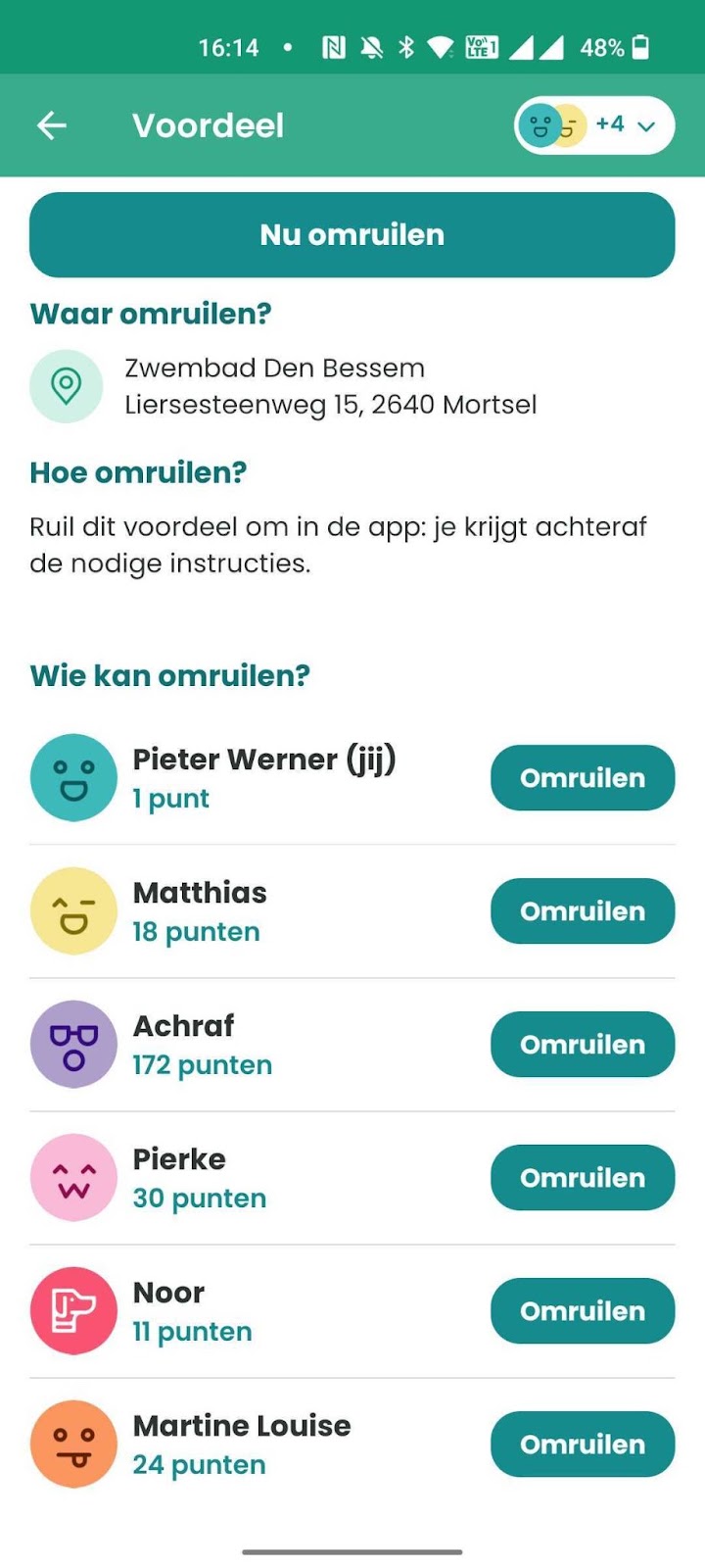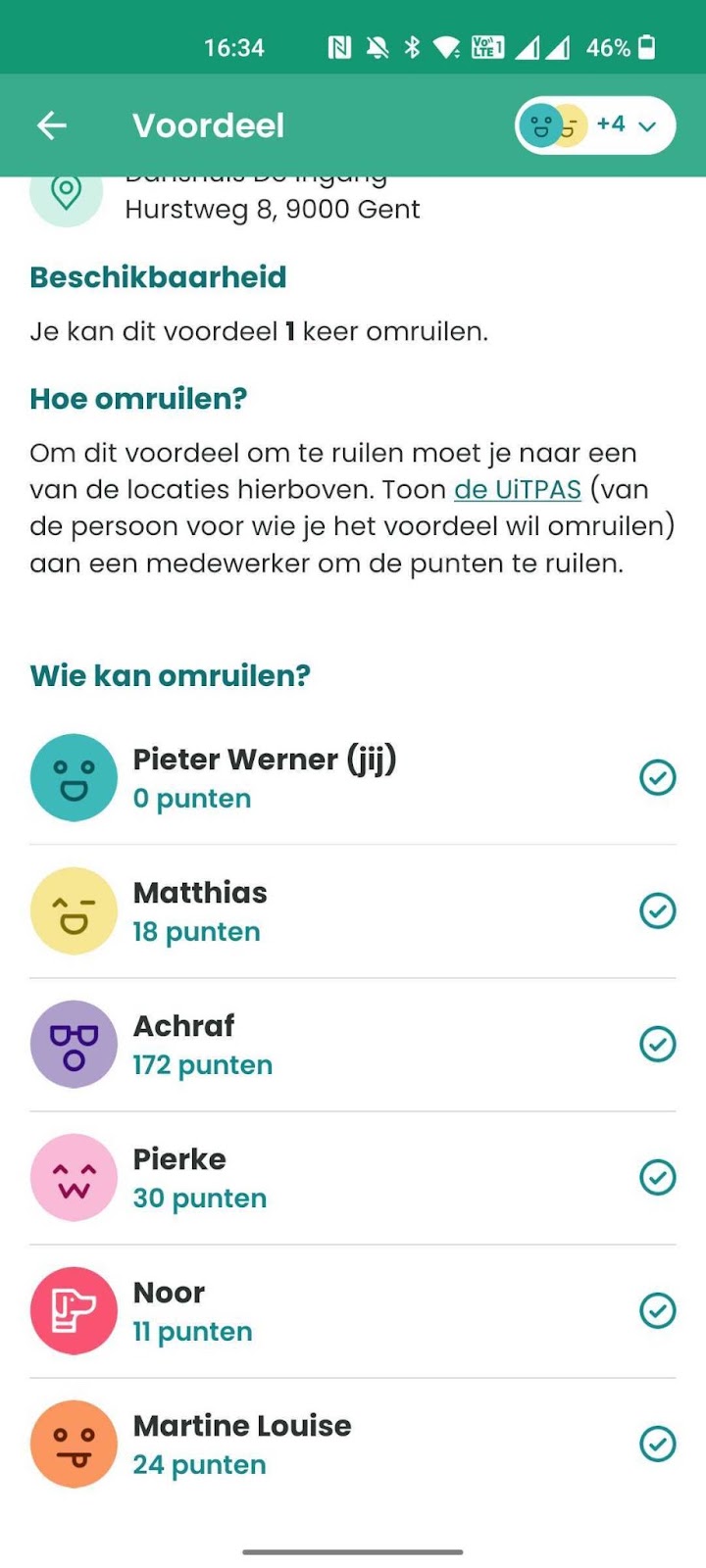 Er zijn ook voordelen die je niet in de app kan omruilen, maar enkel op de locatie. Bij die voordelen zie je meteen wie het kan omruilen: naast de gezinsleden die genoeg punten gespaard hebben staat een groen vinkje.